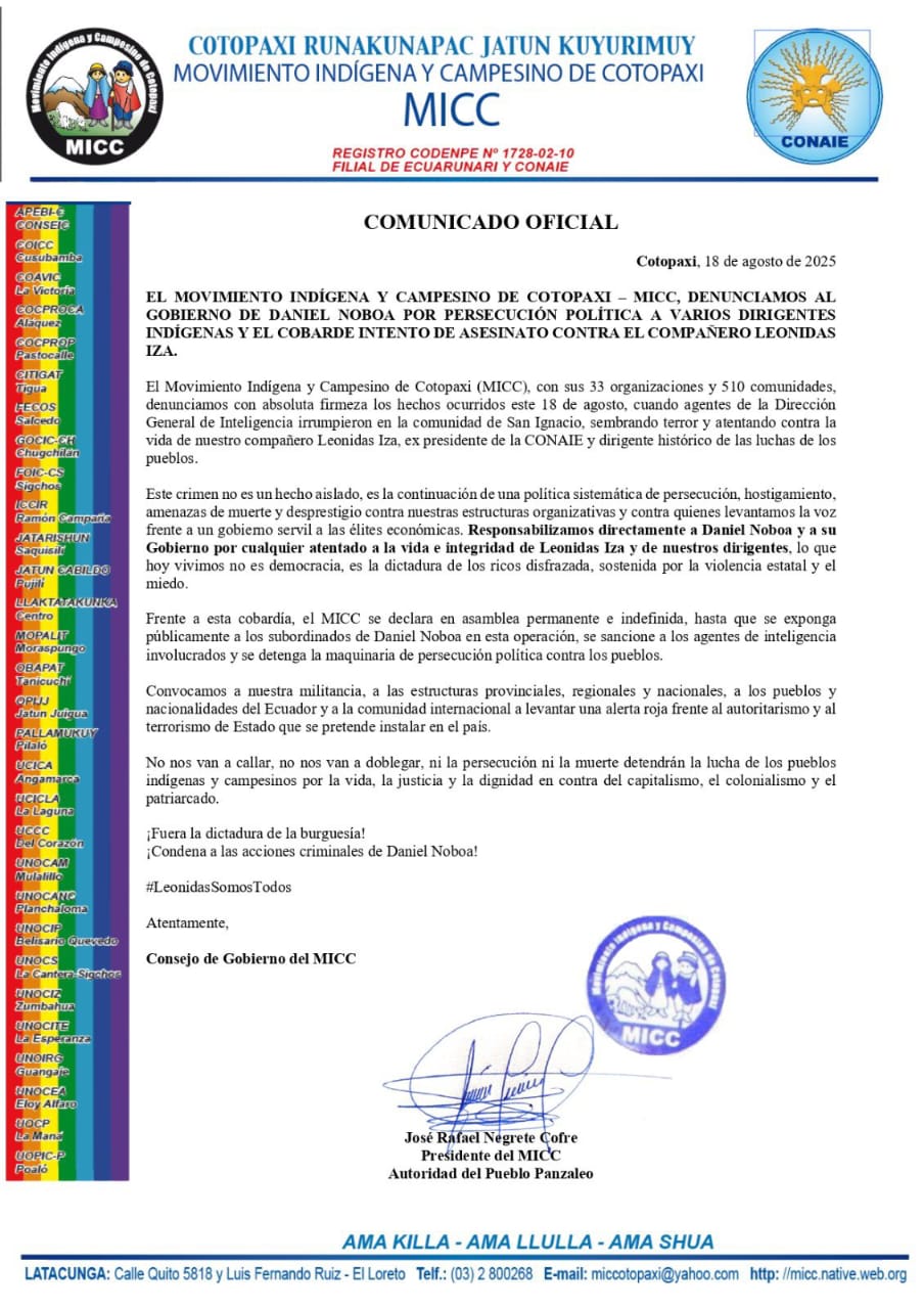 No dia 18 de agosto de 2025, o líder indígena Leónidas Iza Salazar foi vítima de uma tentativa de assassinato na comunidade de SanIgnacio, província de Cotopaxi, no Equador, onde reside.