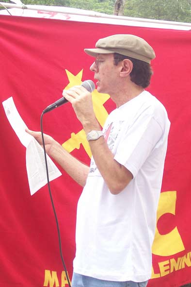 Professor Antônio Cícero Cassiano, Presidente do CEPPES, realiza leitura do Manifesto do 1° de Maio de 2009 elaborado pelo Comitê de Luta Contra o Neoliberalismo-RJ. Quinta da Boa Vista, Rio de Janeiro-RJ.